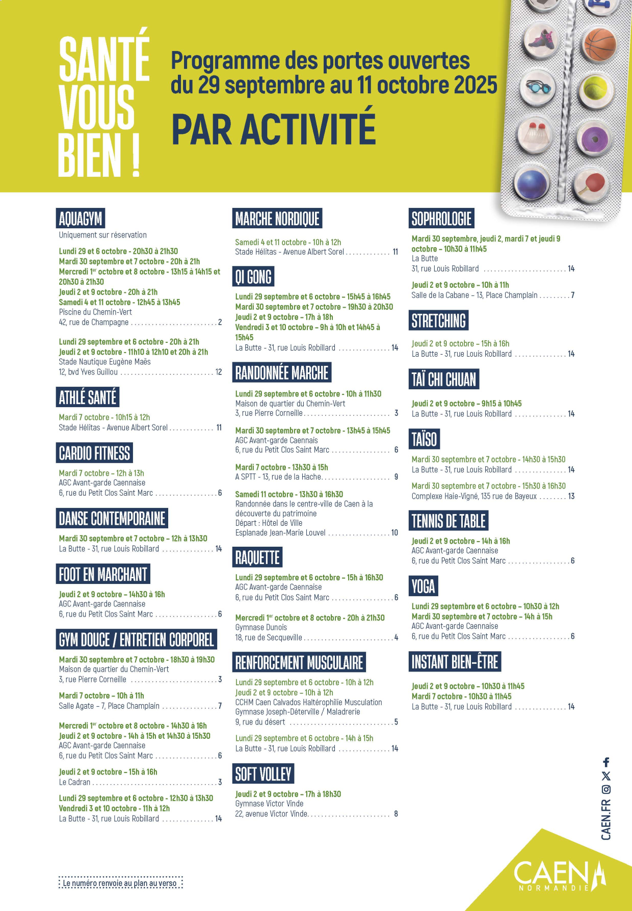 9 clubs caennais vous accueillent gratuitement et sans inscription pour découvrir 19 activités différentes sur 45 créneaux par semaine !
